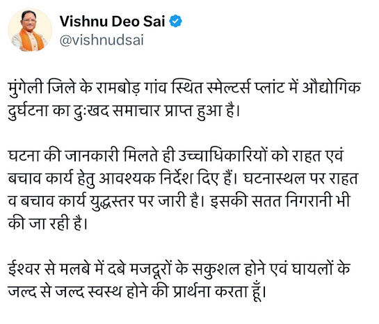 उन्होंने कहा कि मुंगेली जिले के रामबोड़ गांव स्थित स्मेल्टर्स प्लांट में औद्योगिक दुर्घटना का दुःखद समाचार प्राप्त हुआ है। घटना की जानकारी मिलते ही उच्चाधिकारियों को राहत एवं बचाव कार्य हेतु निर्देश दिए हैं। घटनास्थल पर राहत व बचाव कार्य युद्धस्तर पर जारी है। इसकी सतत निगरानी भी की जा रही है। ईश्वर से मलबे में दबे मजदूरों के सकुशल होने एवं घायलों के जल्द से जल्द स्वस्थ होने की प्रार्थना करता हूँ।